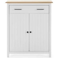 Meuble de rangement d’appoint avec une structure en pin massif blanc et plateau ciré couleur chêne. S’accorde avec de nombreux styles. Offre un espace de rangement spacieux grâce à 1 tiroir et 2 portes. Design contemporain qui apportera une touche de modernité dans votre espace !