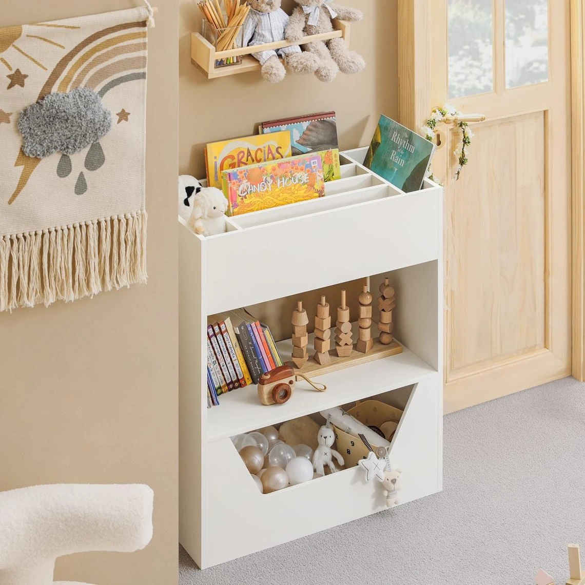 - Design neutre blanc qui convient aussi bien pour les filles que pour les garçons. Avec 1 compartiment ouvert, 1 étagère et 1 grande boîte de rangement, il offre beaucoup d’espace pour classer les livres et jouets pour enfants.
