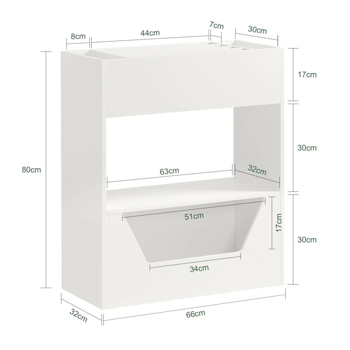 - Matériaux : bois MDF (E1) laqué blanc. Dimensions (L x P x H) : 32 x 66 x 80 cm. Capacité de charge : 30 kg. Attention : Ascension interdite ! À utiliser sous la surveillance d’un adulte.