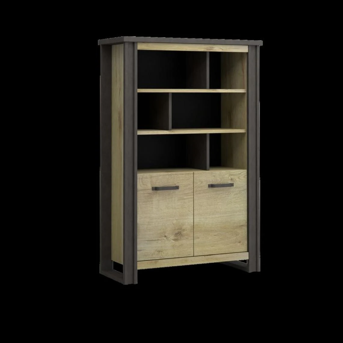 Portes :2 avec charnières métalliques avec freins. . Teinte :imitation chêne. . Garantie :2 ans, pièces. . Poignées :métal noir mat. . Structure :en panneaux de particules, revêtus de papier décor. Fond de meuble en panneau de fibre de moyenne densité noir. . Tablettes :en 25 mm. . A monter soi-même. . Dimensions en cm :L.119 -H.180 -P.42. . Dispo pcs détachées donnée fournisseur :2 ans. .