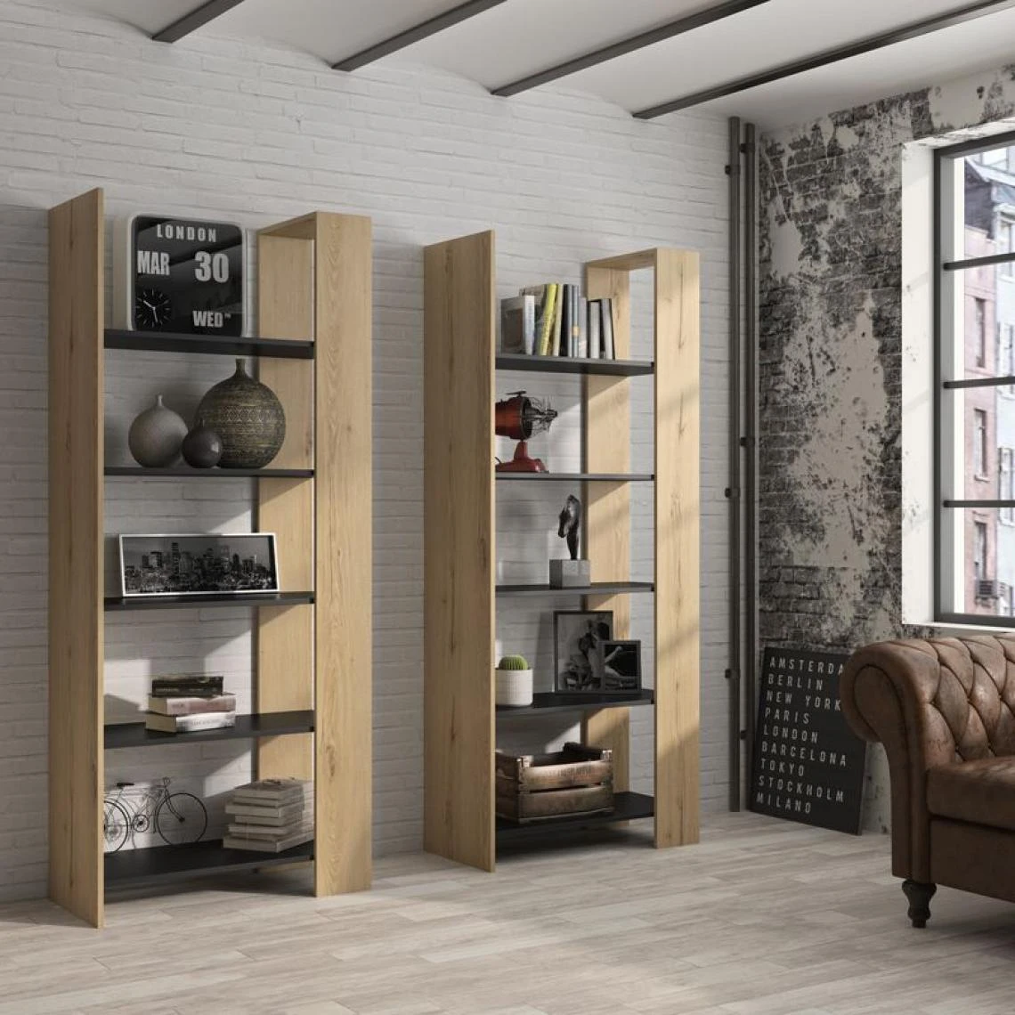 Cette bibliothèque noire et imitation chênemise sur une conception bicolore inspirée du style industriel. Comme elle ne possède pas de fond, elle se place aussi facilement en milieu de pièce que contre un mur, laissant alors apparaitre votre papier peint. Elle fait partie d’une collection incluant également une table basse, un meuble TV et un buffet.