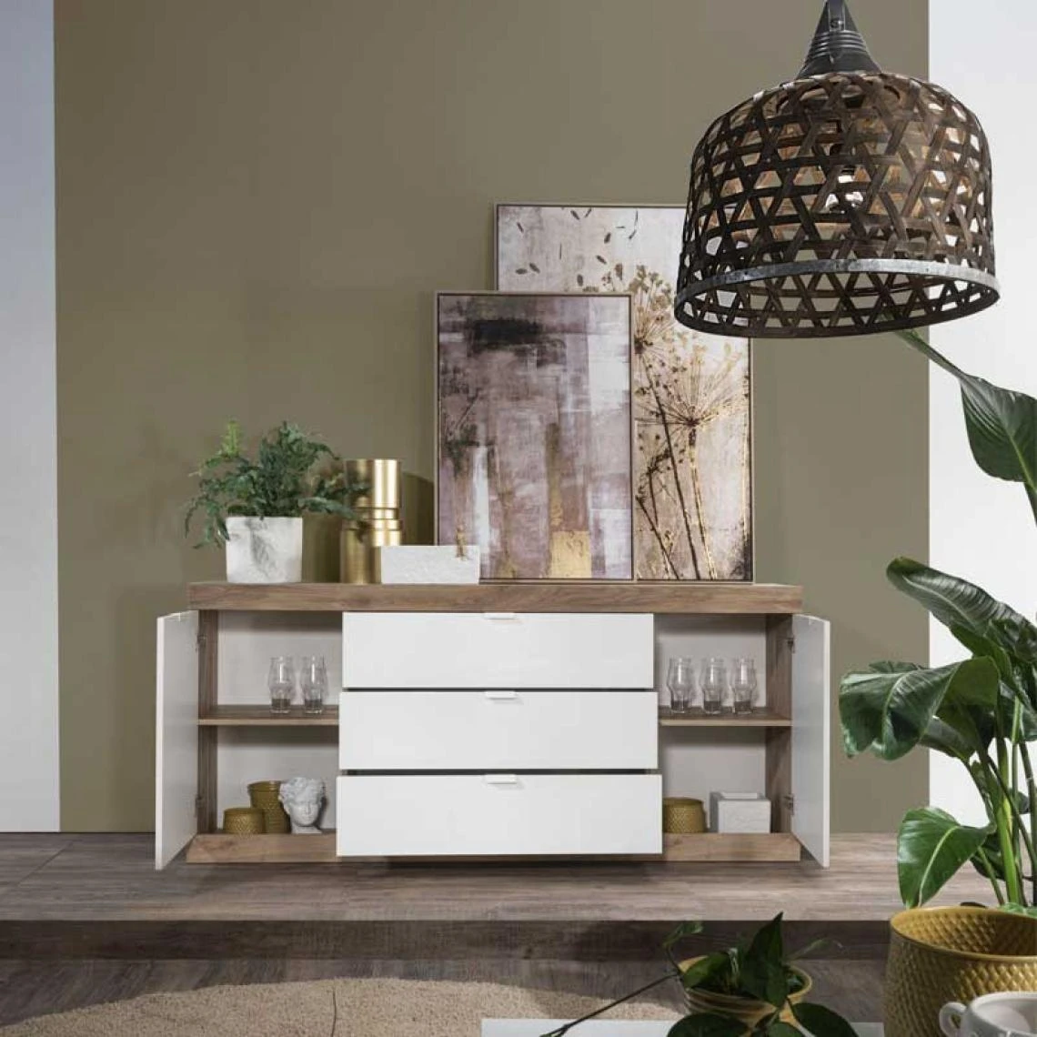Points forts Tousmesmeubles Buffet 2 portes 3 grands tiroirs Blanc laqué brillant/Chêne naturel – SPEZIA