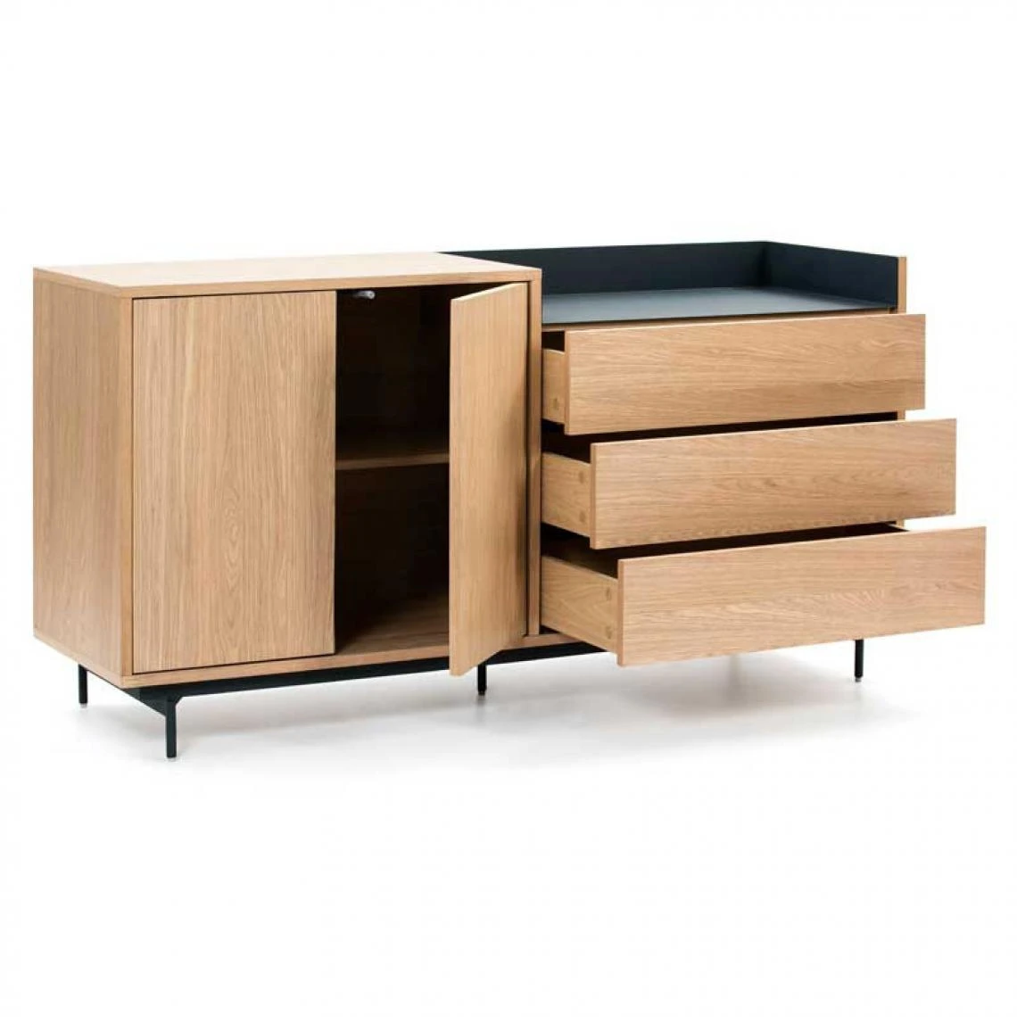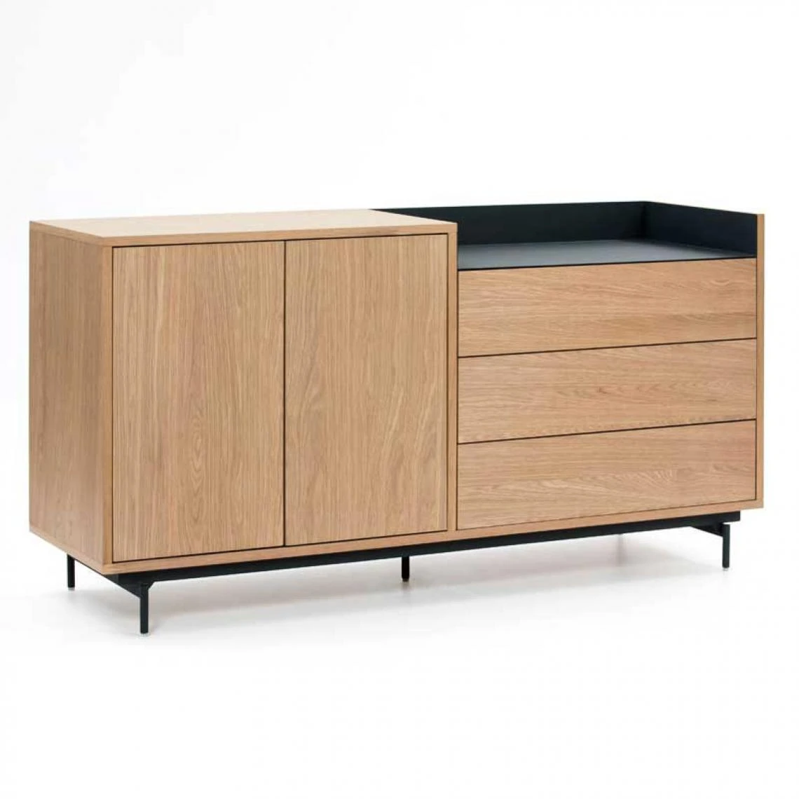 A l’aise dans un coin repas contemporain ce meuble de rangement bénéficie d’une grande robustesse et d’une légèreté visuelle satisfaisante grâce à son piétement en métal laqué Bleu pétrole, assorti à l’empiècement du plateau.