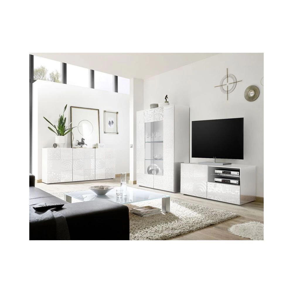 Cet argentier contemporain au format original met en avant une façade sérigraphiée de motifs variés qui sont mis en relief par la véritable laque Blanc ultra haute brillance.
