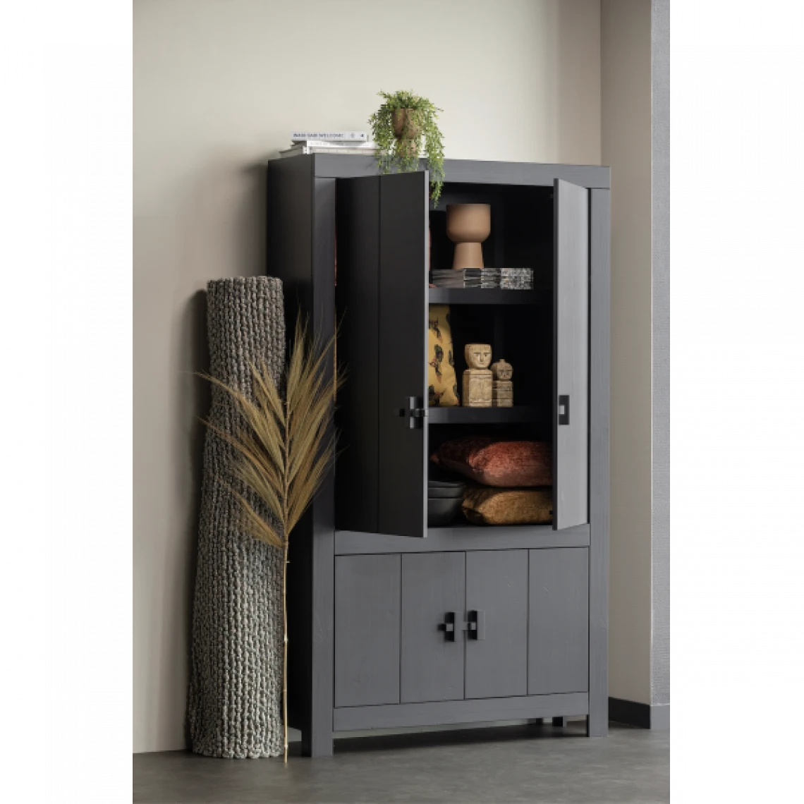 Cette armoire avec portes fait partie de la série de meubles Benson de la collection de la marque néerlandaise WOOOD. La série Benson est connue pour son aspect robuste et solide en bois noir mat.