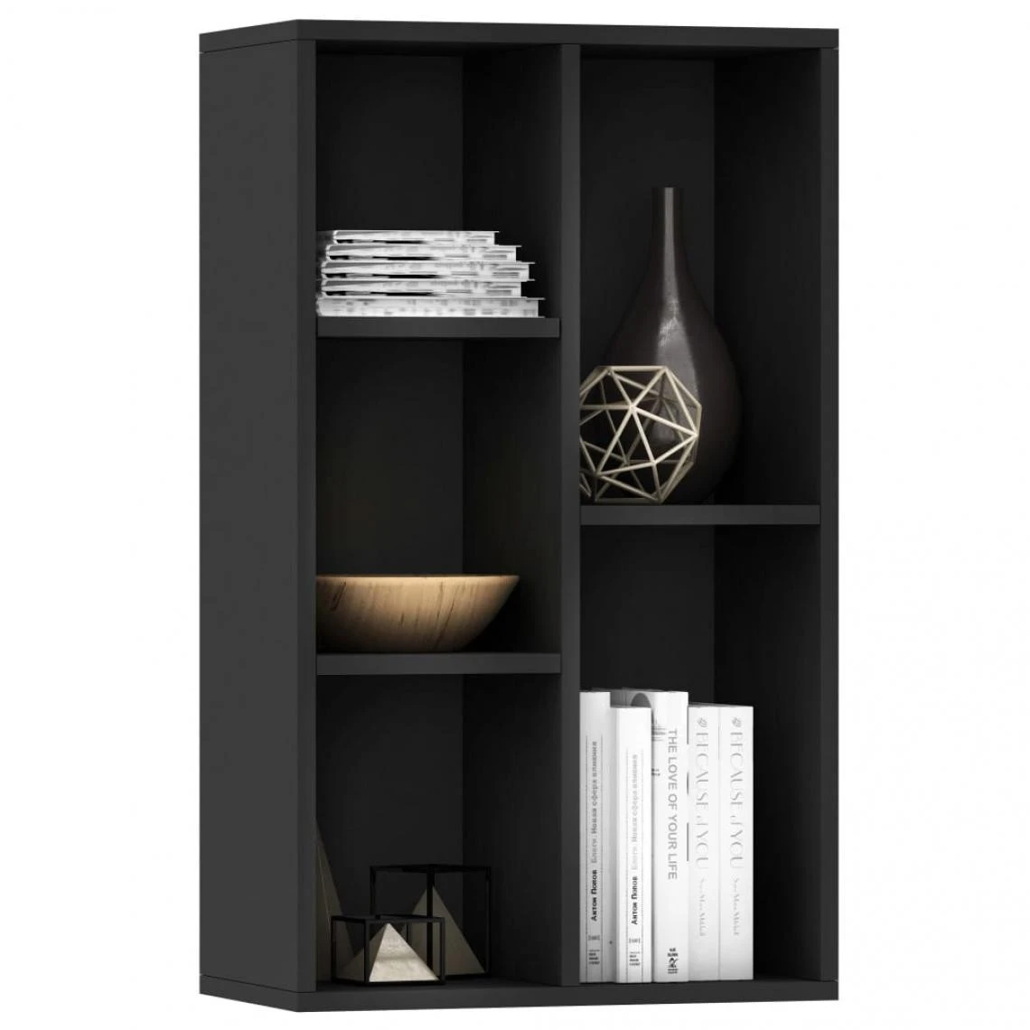 Dotée d’un design élégant et classique, cette bibliothèque ajoutera une touche décorative et pratique à votre décoration. Le meuble est constitué de panneaux de particules, ce qui lui assure solidité, durabilité et longévité. Conçue avec 5 compartiments, la bibliothèque offre un grand espace de stockage pour garder vos magazines, livres, DVD et appareils multimédia bien organisés et à portée de main. En outre, en tant qu’étagère polyvalente, le porte-livre peut également être placé horizontalement comme buffet, ce qui en fait le choix idéal pour votre espace de vie. L’étagère à livres est facile à nettoyer avec un chiffon humide. Cette bibliothèque est facile à assembler avec des matériaux de montage inclus.