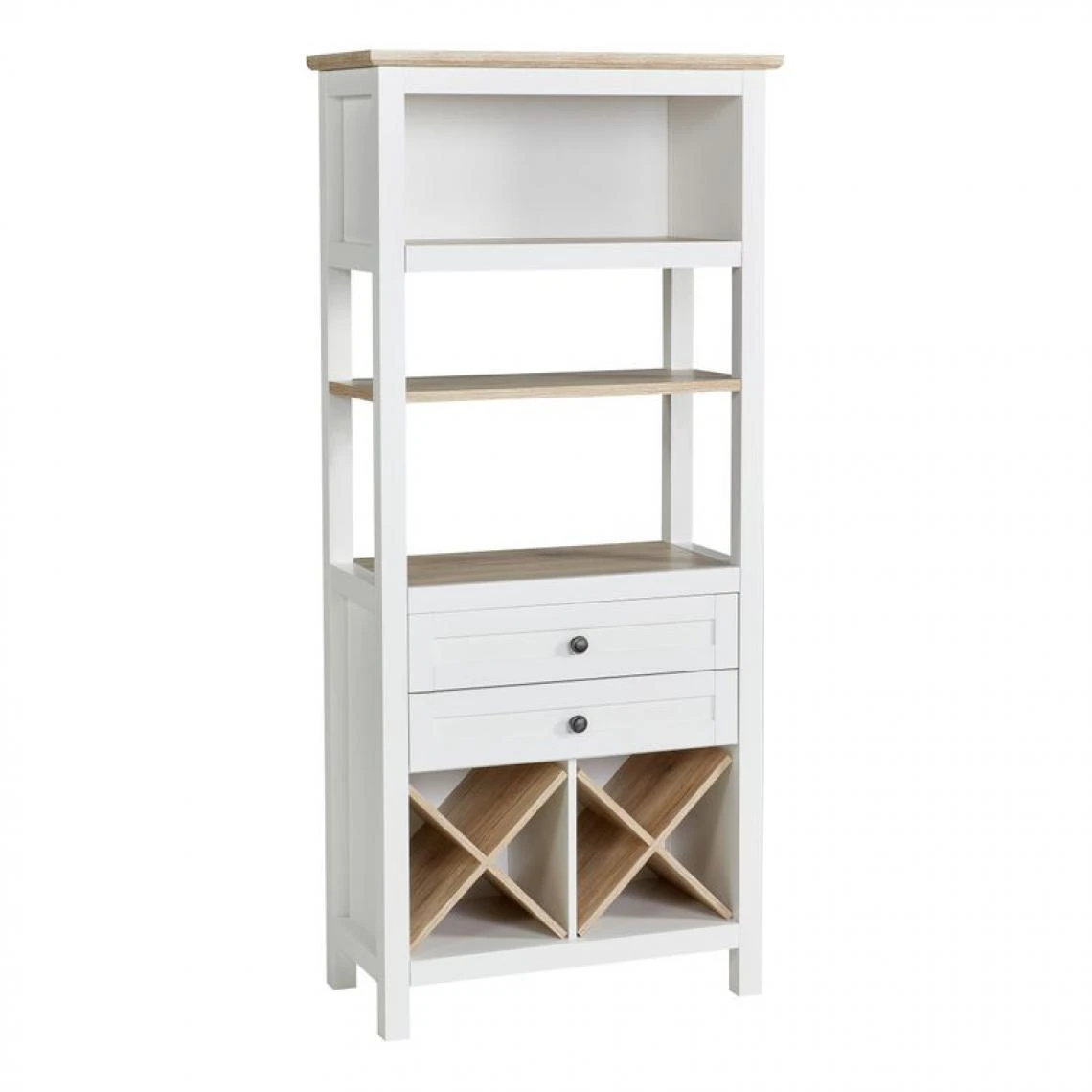 Un espace de rangement pratiqueInstallé dans le cellier ou la cuisine, le buffet haut BOCAGE vous sera très utile au quotidien. Peu encombrant, il occupe un minimum de place au sol. Sa partie supérieure se compose d’une niche confortable, parfaite pour le classement des préparations en conserve et des denrées sèches. Ce buffet haut s’accompagne également de deux étagères ouvertes : vous pourrez y placer un petit micro-ondes et y installer vos carnets de recettes. Pour compléter ces espaces de rangement, deux tiroirs se montreront pratiques pour ranger vos ustensiles de cuisine. Enfin, ce buffet haut de dimensions L. 84 x H. 190 x P. 42 cm comporte un emplacement spécialement dédié au rangement des bouteilles.Un style campagne élégantMeuble de fabrication européenne, ce buffet haut blanc adopte un style campagne élégant. On est séduit par son esthétique bicolore, associant un revêtement décor mélaminé blanc à une finition chêne. On apprécie aussi son design en colonne au rendu harmonieux. Il s’accordera facilement avec des meubles aux tons naturels.